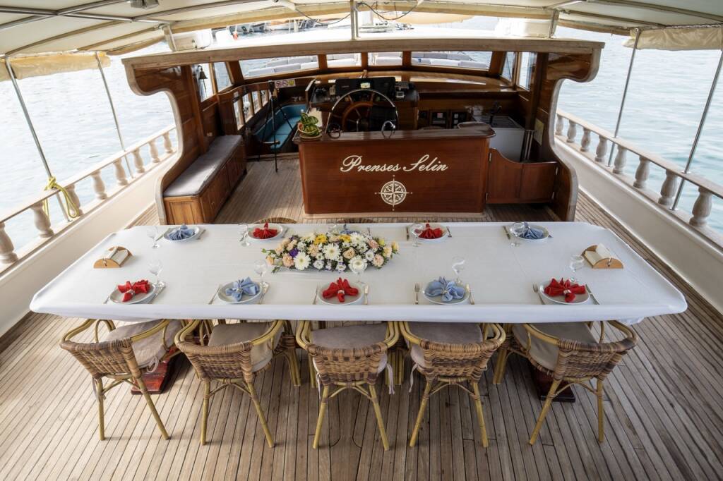 Diese Yacht Prenses Selin (Gulet - Baujahr 2005) liegt in der Fethiye, Ece Saray Marina Resort, Aegean, Türkei. Sie verfügt über 8 Kabinen, bietet Ihnen Platz für 0 Personen und hat 8 WC.