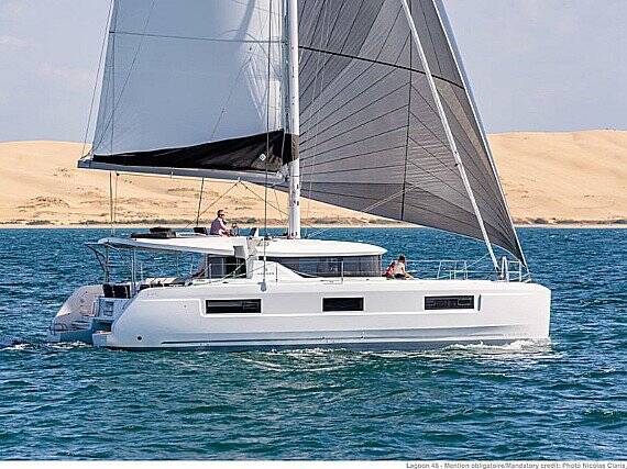 Diese Yacht Lagoon 46 (Katamaran - Baujahr 2021) liegt in der Skiathos, Skiathos/Sporades, Volos, Griechenland . Sie verfügt über 4 + 2 Kabinen, bietet Ihnen Platz für 12 Personen und hat 4 + 1 WC.
