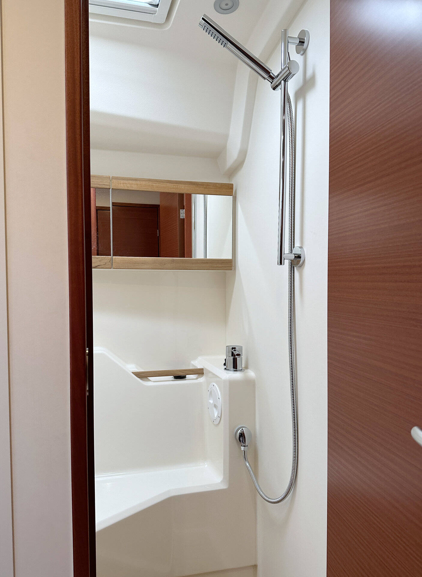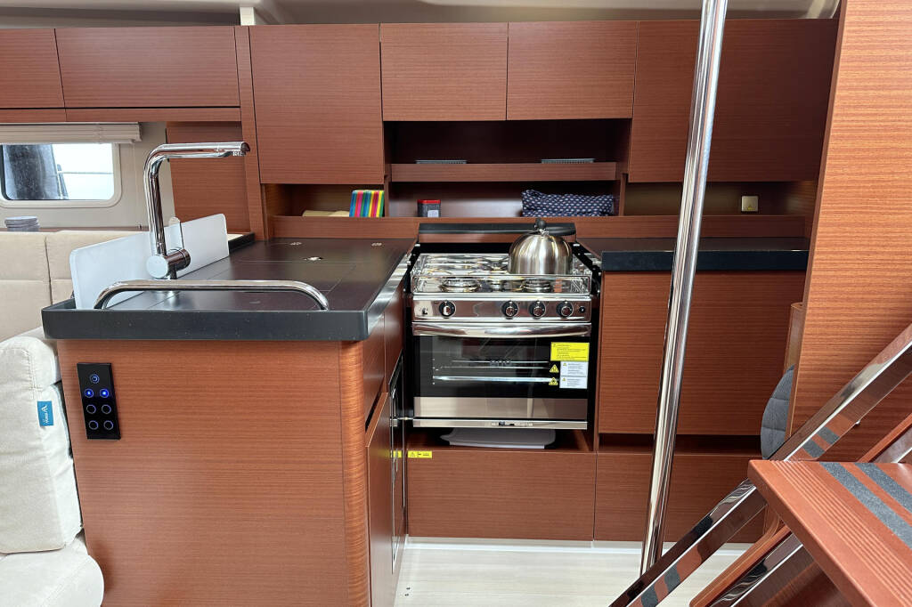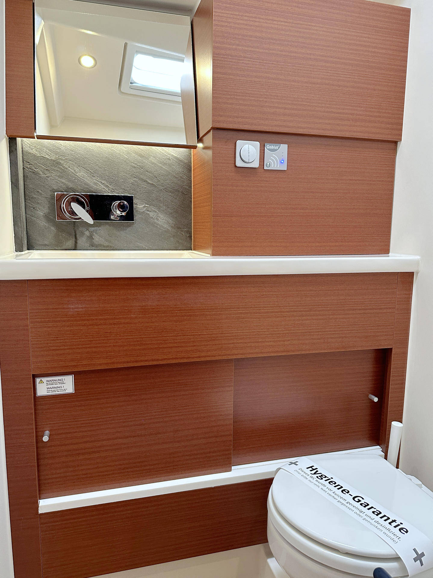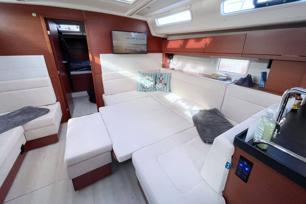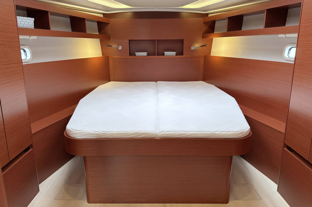 Teak auf dem Cockpitboden und auf dem Decksaufbau, Fußstützen für Steuermann, 2 x Springklampen, elektrische Ankerwinsch 1000W mit Sicherungsautomat und Fernbedienung mit Ankerkettenzähler, Delta-Anker 20Kg mit 60m Kette, Luken in den seitlichen Aufbaufenstern zum Öffnen, Dusche im Cockpit (kalt/warm), 2 x GFK Steuerräder, Quantum AC5 Performance Segel – durchgelattetes Großsegel - Triradial geschnitten, Selden MDS Mastrutschersystem, Dyneema-Fallen, 2x LEWMAR 45 ST EVO Genuawinschen, Fußbodenbeleuchtung im Niedergang und im Cockpit, 2 Lüfter für Aufbauluken, Indirekte Beleuchtung in Salon und Kabinen, LED Deckenbeleuchtung in Salon und Eignerkabine, dimmbar; SLS – Scenario Licht System - Touch Screen Controller und Dimmer im Salon und Eignerkabine, Rolloset mit Fliegengitter für Decksluken, Rollos für Rumpffenster, Faltplissees für seitliche Kajütdachfenster, Kabelloses Ladegerät, FUSION MS RA70N Multimedia Radio mit Bluetooth - für Salon und Cockpit - Subwoofer mit integriertem Verstärker im Salon, 2x 2 Lautsprecher in Salon und Cockpit, Fernsteuerung Radio im Cockpit, Salontisch absenkbar für Doppelbett, Seitendurchstieg für Reling, Teak Scheuerleiste, Anker- und Vorstagsbeschlag mit Doppelrolle inkl. Gennaker/-Crossoverauge (gegen Aufpreis siehe Extras), 3-Blatt Faltpropeller, Stärkere