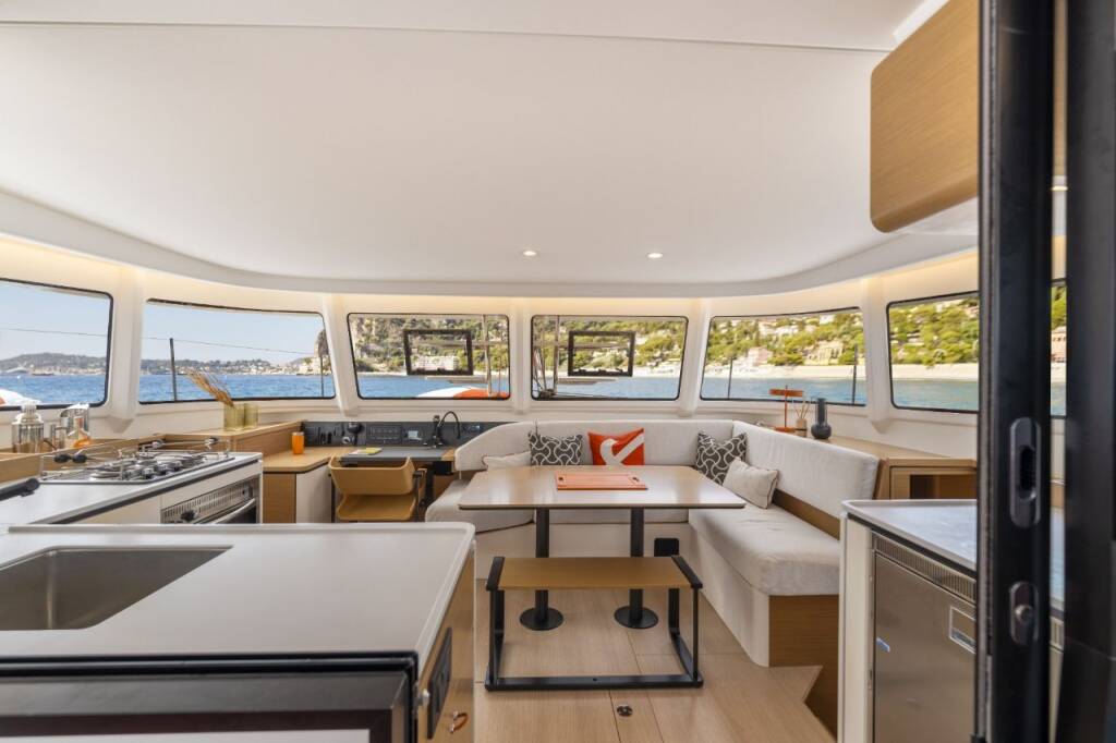 Pulse Line pack : This vessel features a performance-oriented sail plan with triradial cut laminate sails and a square-top mainsail, ensuring exceptional performance even in light winds. The sleek, sporty look is complemented by black lacquered stanchions, textile lifelines, and the iconic orange steering wheels
