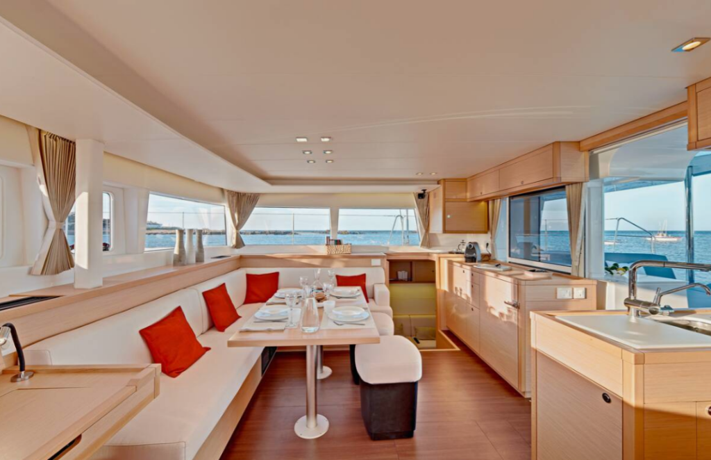 This yacht Lagoon 450 F (Catamaran - year 2019) lies in the Lefkas main port, Ionian Islands, Greece. It has 4 + 1 cabins, accommodate 12 people and has 4 + 1 toilets.