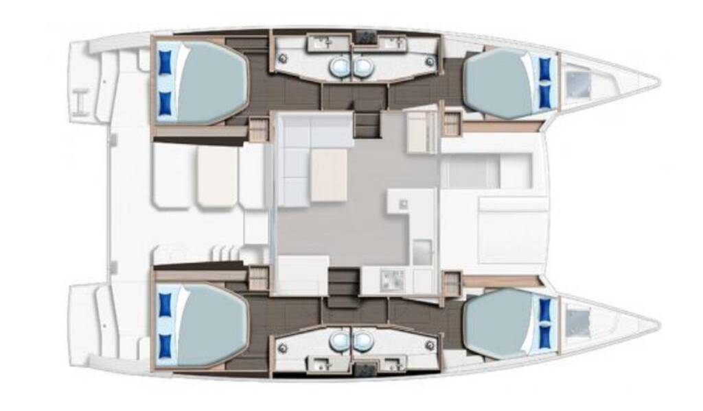 This yacht Leopard 42 (Catamaran - year 2022) lies in the Sardinia, Cannigione, Sardinia, Italy. It has 4 cabins, accommodate 8 + 2 people and has 4 toilets.