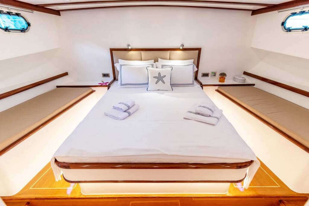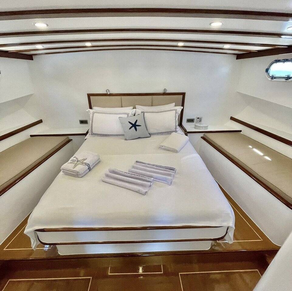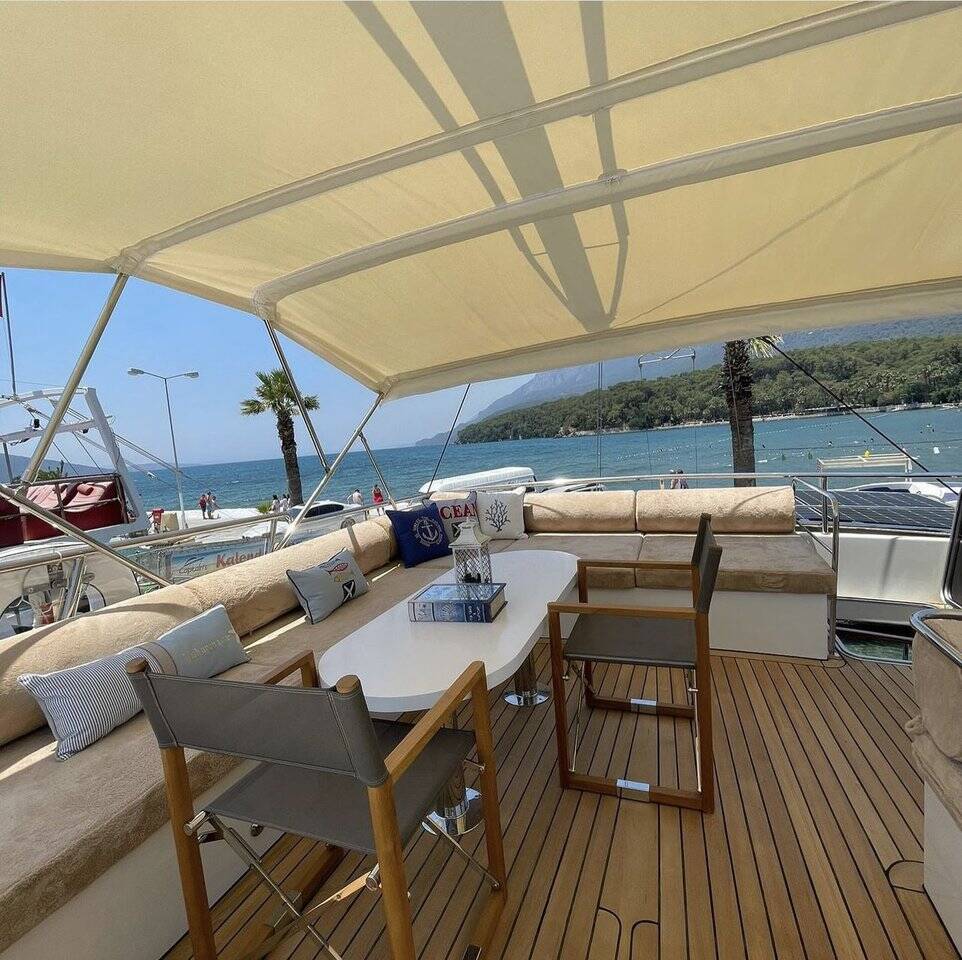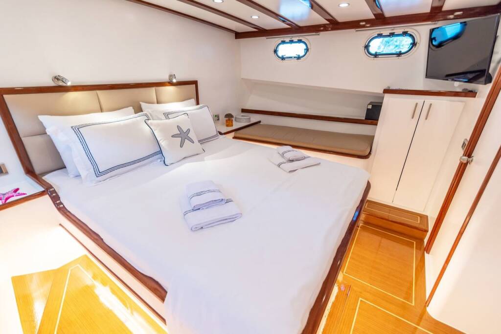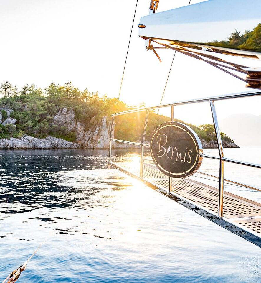 Bernis gulet, our luxury gulet with 3 cabins, which was completed in 2022 and descends to the water, serves you, blue cruise lovers, in the magnificent bays of Göcek, departing from Fethiye Göcek harbor. Göcek region, which is one of the most popular holiday destinations in the world with its magnificent bays and fascinating untouched nature, has become a popular region in recent years. Bernis gulet in the luxury Gulet class has a total of 3 cabins. Cabin architecture; It consists of 1 master and 2 double cabins. There is no obligation to charter a week in Bernis gulet, which has a total accommodation capacity of 6 people. It has a full length of 18 meters and a width of 5.5 meters. There are 3 personnel, including 1 captain and 1 cook and 1 deckhand on our boat. There is no weekly rental obligation on our boat. You can rent a minimum of 3 nights or more. Entrance to our boat is at 15:00 and the departure is at 09:30 the next morning of your last night. Our Bernis gulet boat has equipment such as air conditioning, Wi-Fi, canoe, paddleboard, water sports, generator, watermaker, cinema projector, ice machine.. Every detail has been considered for your cruise boat holiday. Before the boat vacation, our boat chef will contact you and plan your shopping list together. We are happy to serve you on the way we set out with the right analysis, the right boat and the right service, and the understanding of mission.