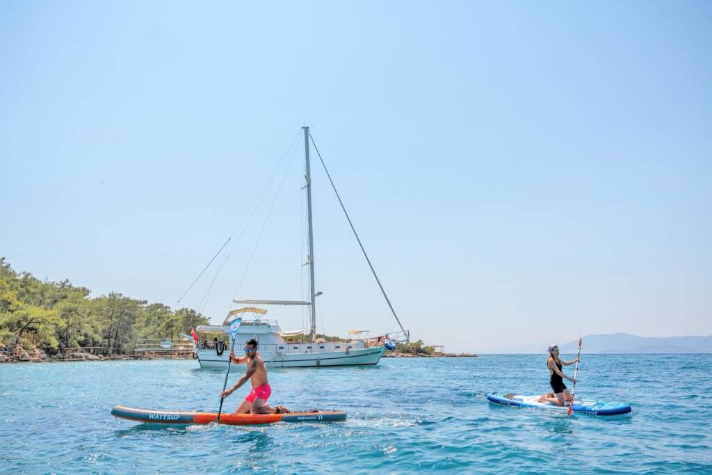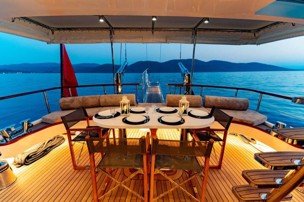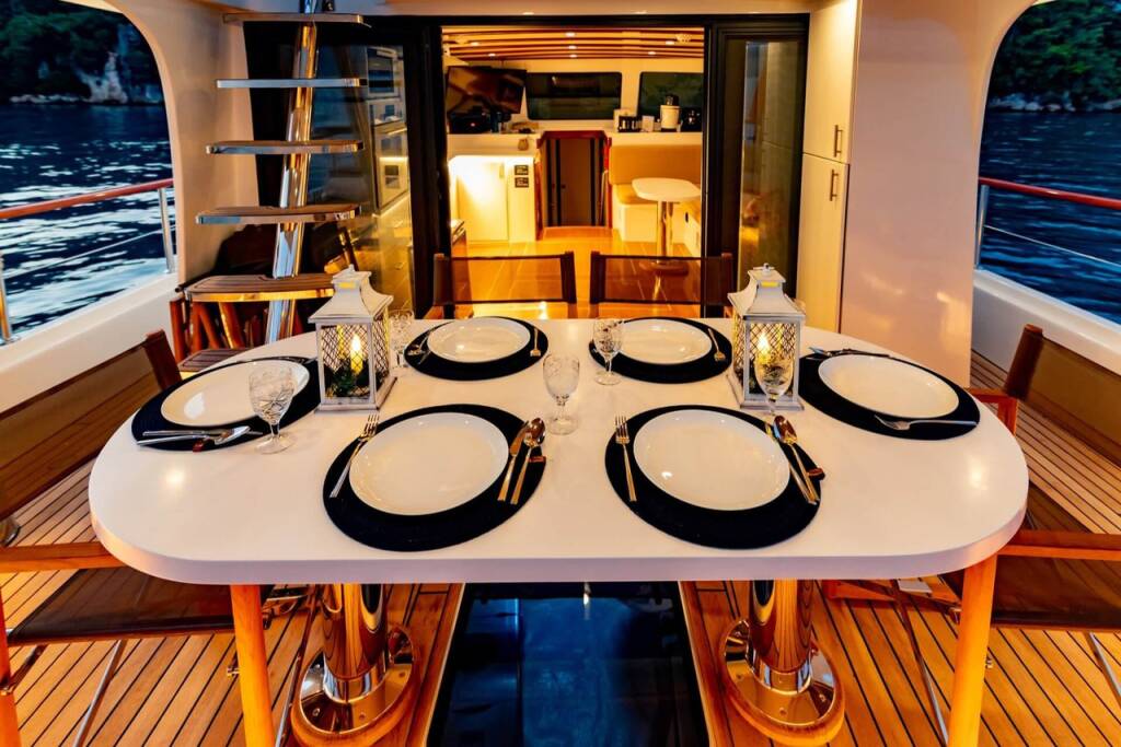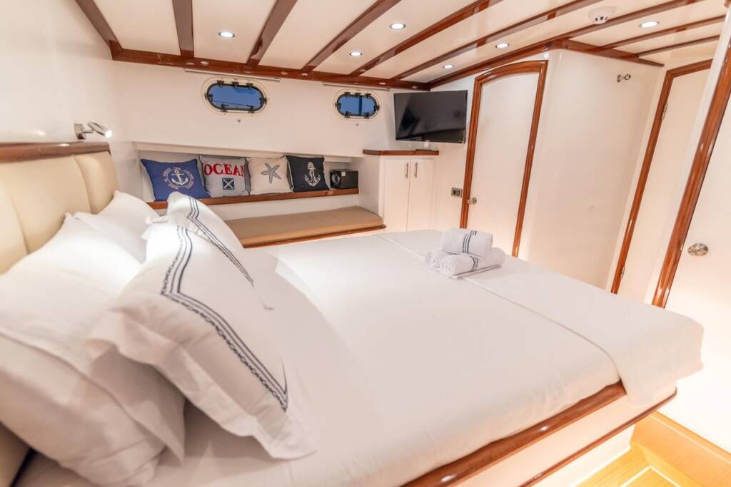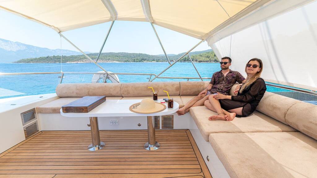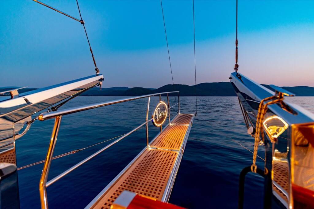 Bernis gulet, our luxury gulet with 3 cabins, which was completed in 2022 and descends to the water, serves you, blue cruise lovers, in the magnificent bays of Göcek, departing from Fethiye Göcek harbor. Göcek region, which is one of the most popular holiday destinations in the world with its magnificent bays and fascinating untouched nature, has become a popular region in recent years. Bernis gulet in the luxury Gulet class has a total of 3 cabins. Cabin architecture; It consists of 1 master and 2 double cabins. There is no obligation to charter a week in Bernis gulet, which has a total accommodation capacity of 6 people. It has a full length of 18 meters and a width of 5.5 meters. There are 3 personnel, including 1 captain and 1 cook and 1 deckhand on our boat. There is no weekly rental obligation on our boat. You can rent a minimum of 3 nights or more. Entrance to our boat is at 15:00 and the departure is at 09:30 the next morning of your last night. Our Bernis gulet boat has equipment such as air conditioning, Wi-Fi, canoe, paddleboard, water sports, generator, watermaker, cinema projector, ice machine.. Every detail has been considered for your cruise boat holiday. Before the boat vacation, our boat chef will contact you and plan your shopping list together. We are happy to serve you on the way we set out with the right analysis, the right boat and the right service, and the understanding of mission.