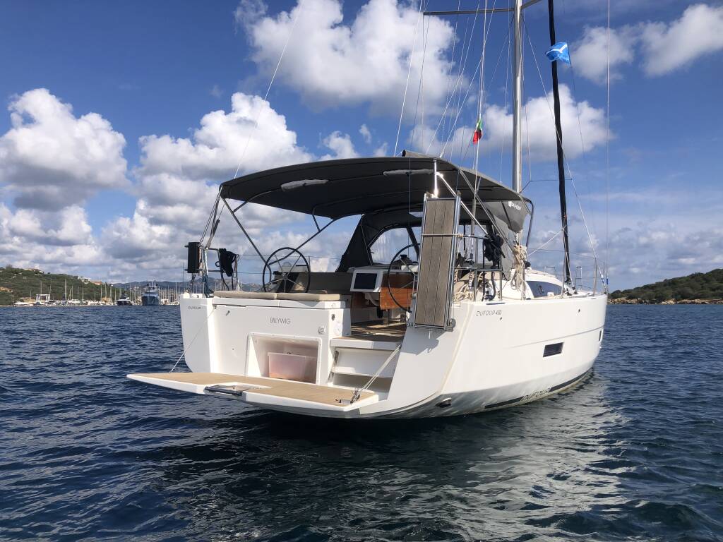 This yacht Dufour 430 (Sailboat - year 2020) lies in the Marina di Portisco, Sardinia, Italy. It has 4 cabins, accommodate 8 people and has 2 toilets.