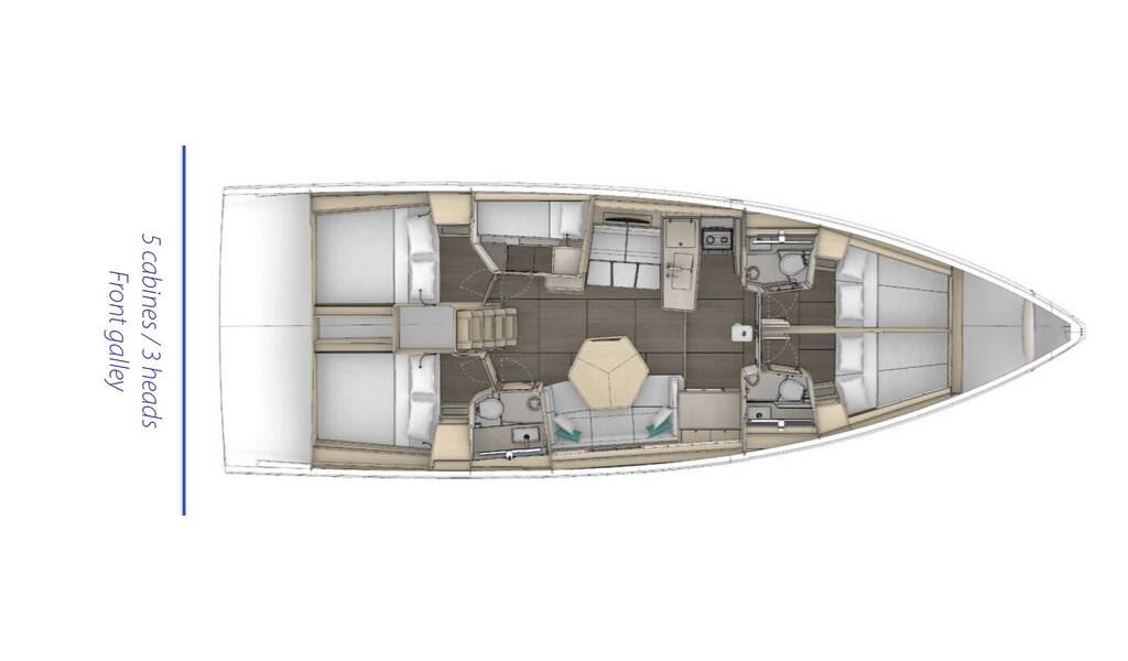 This yacht Dufour 48 (Sailboat - year 2026) lies in the Lefkas main port, Ionian Islands, Greece. It has 5 cabins, accommodate 10 + 2 people and has 3 toilets.