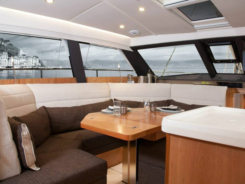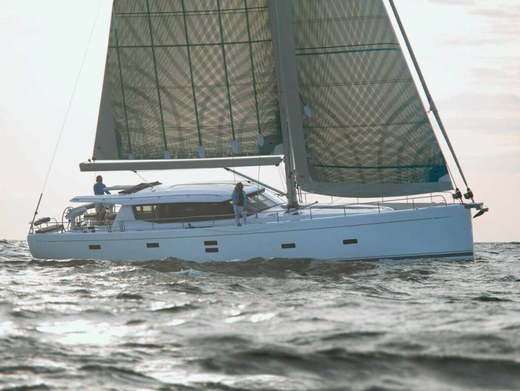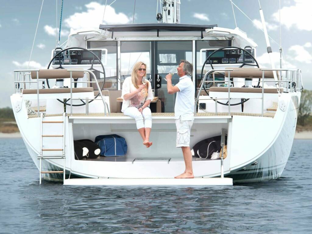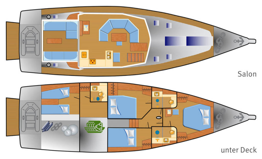 Fusion Multimedia Radio with Bluetooth/DC/DVD for saloon and cockpit, loudspeakers in saloon and cockpit with remote control in cockpit, LED flat screen TVs in cabins and saloon with TV lift system, furniture: teak, floors: Continental Oak, cushions on foredeck, cockpit cushions with back cushions, flexiteak: cockpit floor - cockpit benches - running deck, GRP steering wheels, aluminum cockpit table with teak top - can be lowered electrically to bed area with cushions, Highfield CL 310 dinghy with electric outboard motor 2,5 HP for 2-3 people, compressor for dinghy , Teak rubbing strake, additional stainless steel rubbing strake, underwater lighting in the stern area (multicolor), electric deck wash pump in the anchor locker, front windscreen with hatch that can be opened, electric furling systems, Quantum AC5 furling mainsail and headsail, Spectra halyard, gennaker equipment, LED spreader lights, GPS chart plotter at the chart table, additional electronic throttle at the second helm station, stern thruster 24 V retractable, generator 15000i, heating with fans in all cabins and wet cells, air conditioning in the cabins and in the saloon, freezer, dishwasher in the pantry, washing machine with dryer function, additional diesel tank (total 920l), external sun protection for saloon windows, solar panels on the deck structure, emergency exit from the port aft cabin into the cockpit, remote gas switch and gas alarm in the pantry, 2 x SUP, 1 diving scooter, Delonghi fully automatic machine for whole beans