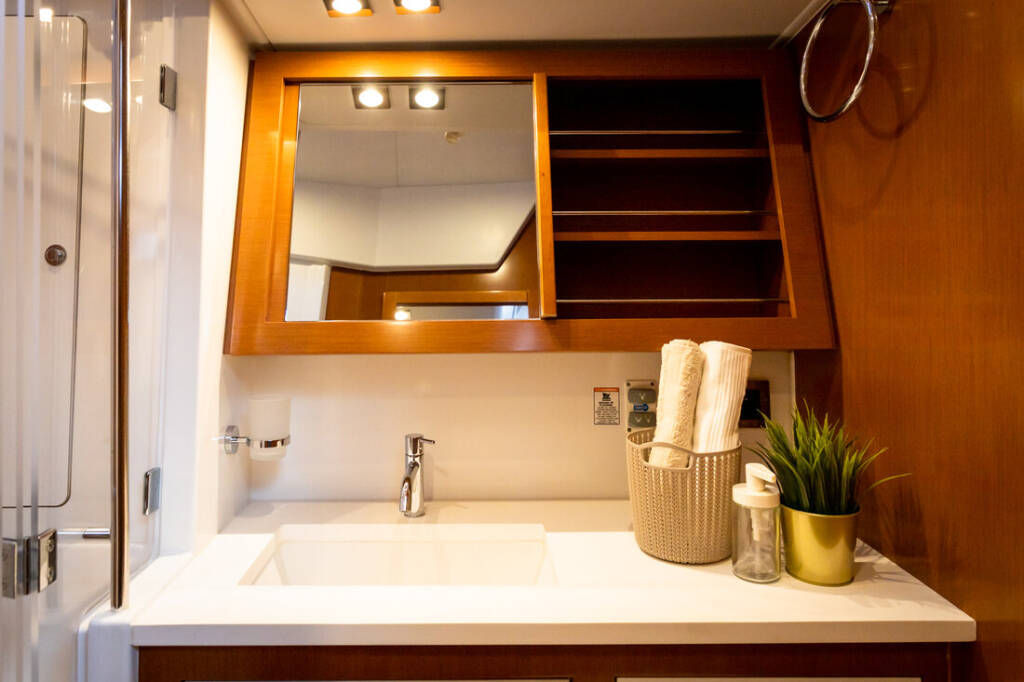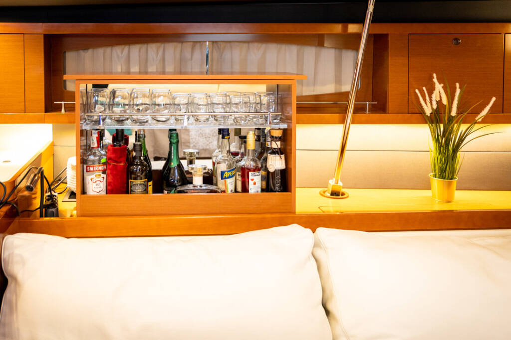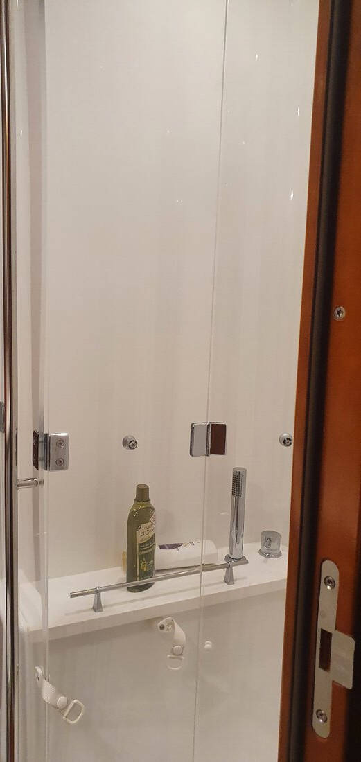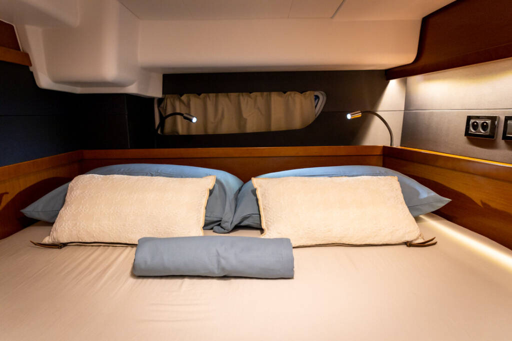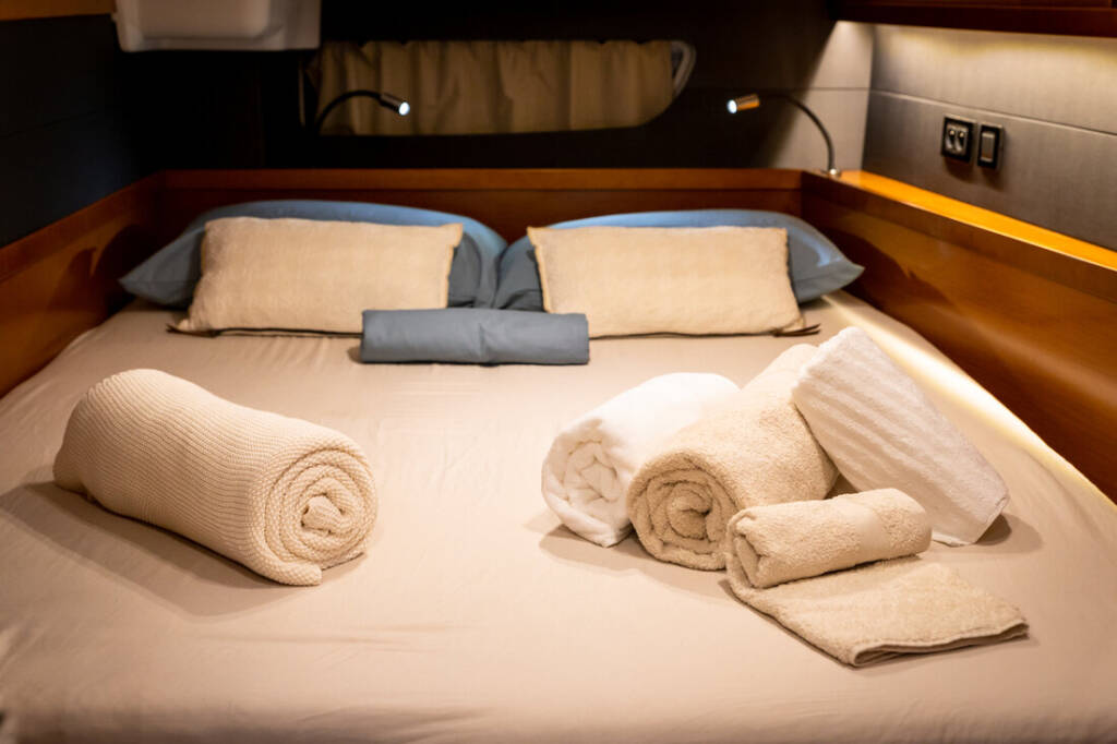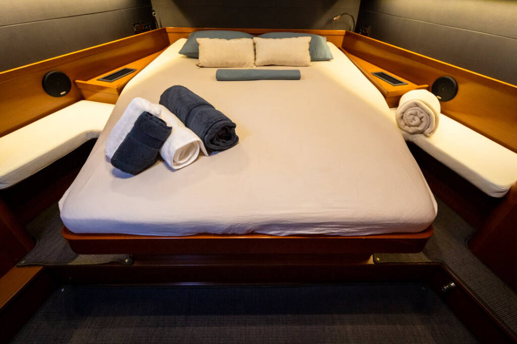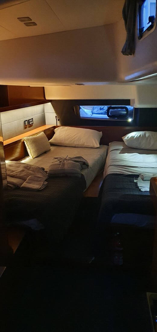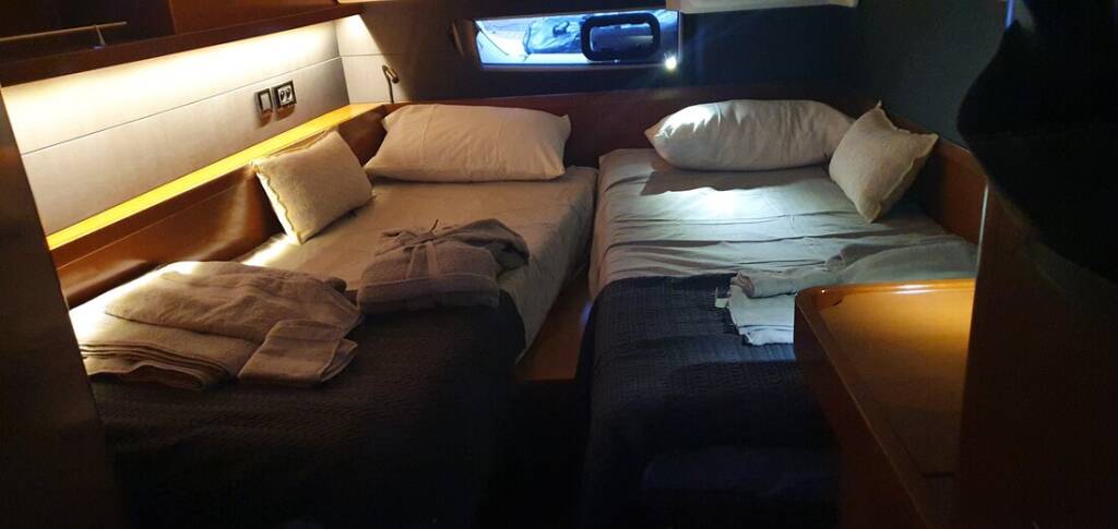 There are 4 cabins (3 inside, 1 outside for the crew 2 persons) + 2 guests can stay in dinette.